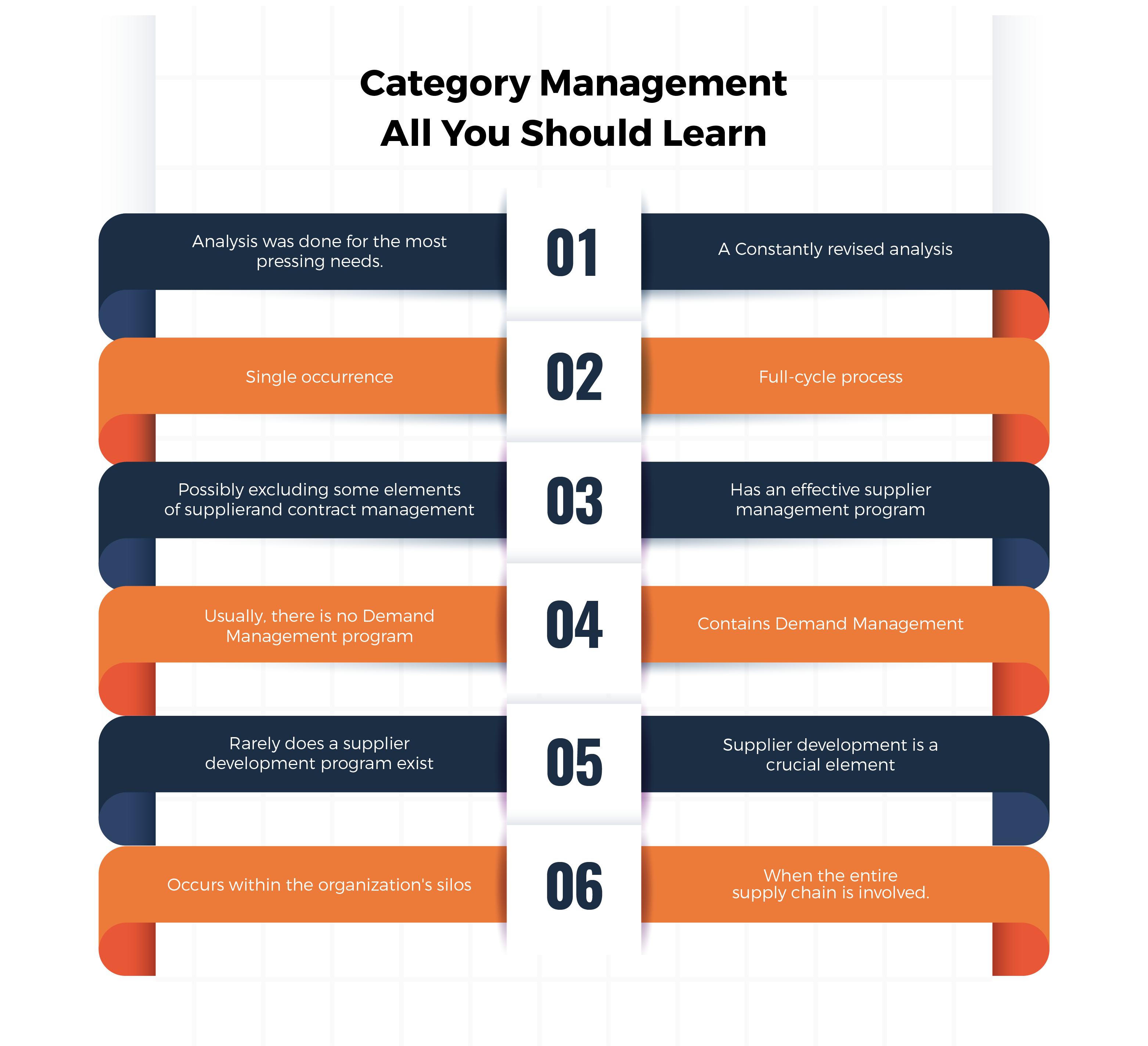 Category management, on the other hand, classifies your organization's supplies into similar groups and allows you to closely monitor and address any ongoing or emerging issues before they become major problems.