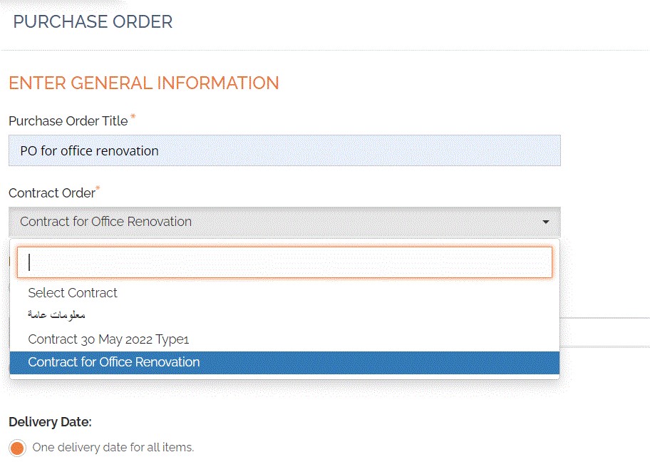 We have selected Create Purchase Order from Contract. And the very next screen that appears for entering the information where we have to enter the title for PO and see… we already have our contract listed there for which we can create a purchase order.
