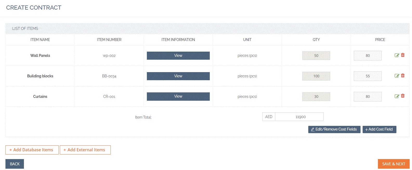 You can either add items from the database or you can select the external items that you want to order, along with the price.