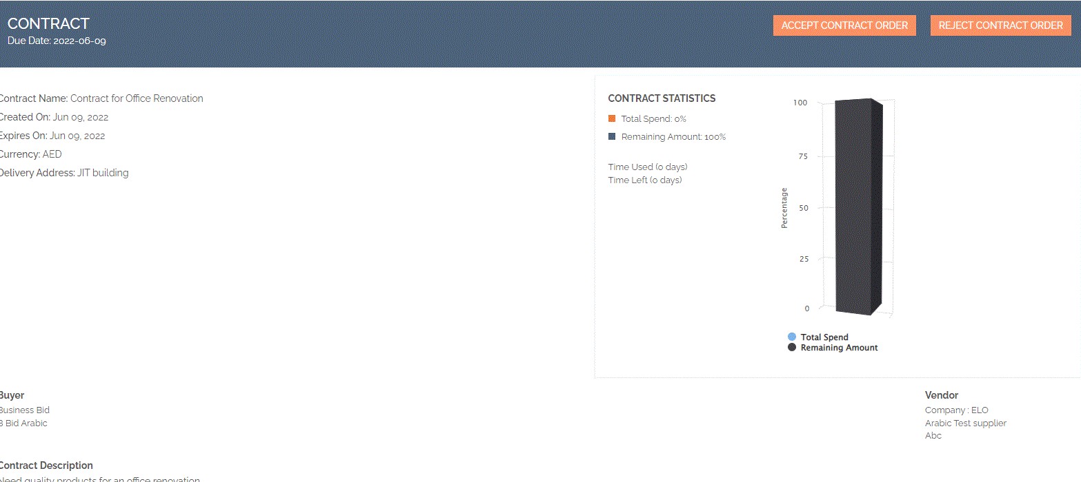 The supplier will receive the contract details and upon reviewing the contract, he can accept or reject the Contract Order.