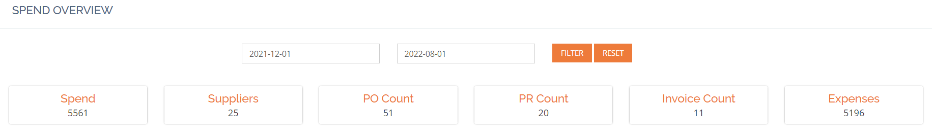 You can view Total Spend, Suppliers, Purchase Order Count, Purchase Requisition Count, Invoice Count, and Total Expenses.